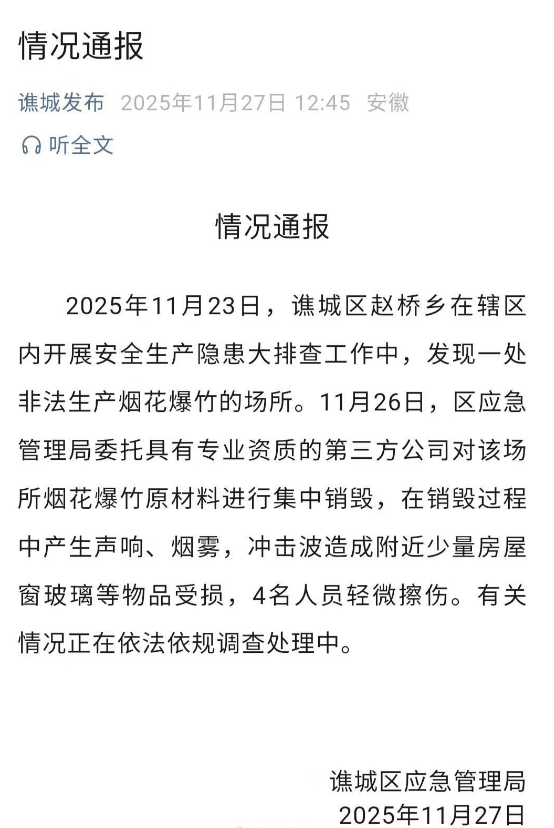 11月27日,安徽亳州谯城区应急管理局发布情况通报:2025年11月23日股票按天配资,谯城区赵桥乡在辖区内开展安全生产隐患大排查工作中,发现一处非法生产烟花爆竹的场所。11月26日,区应急管理局委托具有专业资质的第三方公司对该场所烟花爆竹原材料进行集中销毁,在销毁过程中产生声响、烟雾,冲击波造成附近少量房屋窗玻璃等物品受损,4名人员轻微擦伤。有关情况正在依法依规调查处理中。
