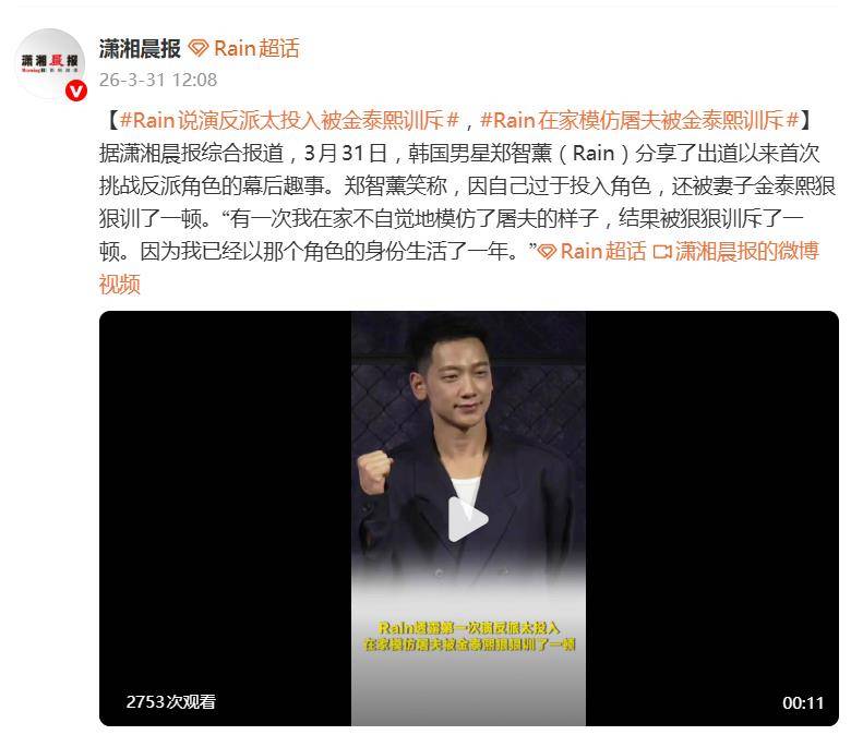 据3月31日报道,韩国男星Rain(郑智薰)一番关于“在家挨训”的爆料,让粉丝们看到了这位天王级偶像的另一面。原来,出道以来首次挑战反派角色的他,竟因为入戏太深,把戏里的状态带回了家,结果被妻子金泰熙“狠狠训了一顿”。